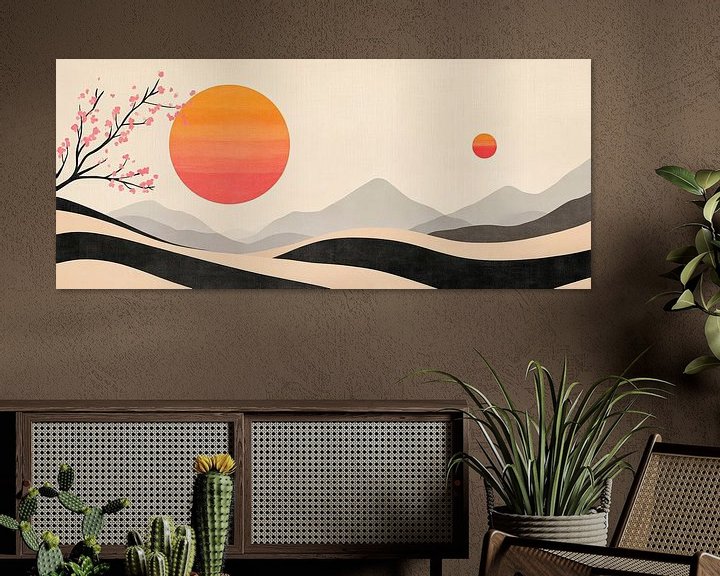 Die sanften Wellen und die warmen Sonnenuntergänge entfalten eine ruhige Harmonie in sanften Apricot- und Erdtönen. Akzentuiert von zarten blühenden Zweigen strahlt das Motiv eine meditative Gelassenheit aus. Perfekt für das Schlafzimmer, schafft es eine Oase der Entspannung und lädt zum Träumen ein.