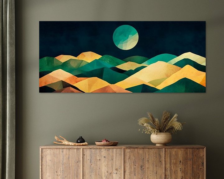 Mystische Hügel in sanften Erdtönen und einem strahlenden, kühlen Mond, die eine harmonische Ruhe ausstrahlen. Die geschwungenen Formen verleihen dem Raum eine einladende Wärme, während der dunkle Hintergrund eine gemütliche Atmosphäre schafft. Ideal für das Wohnzimmer oder eine entspannende Leseecke, wo man den Blick in die Ferne schweifen lassen kann.