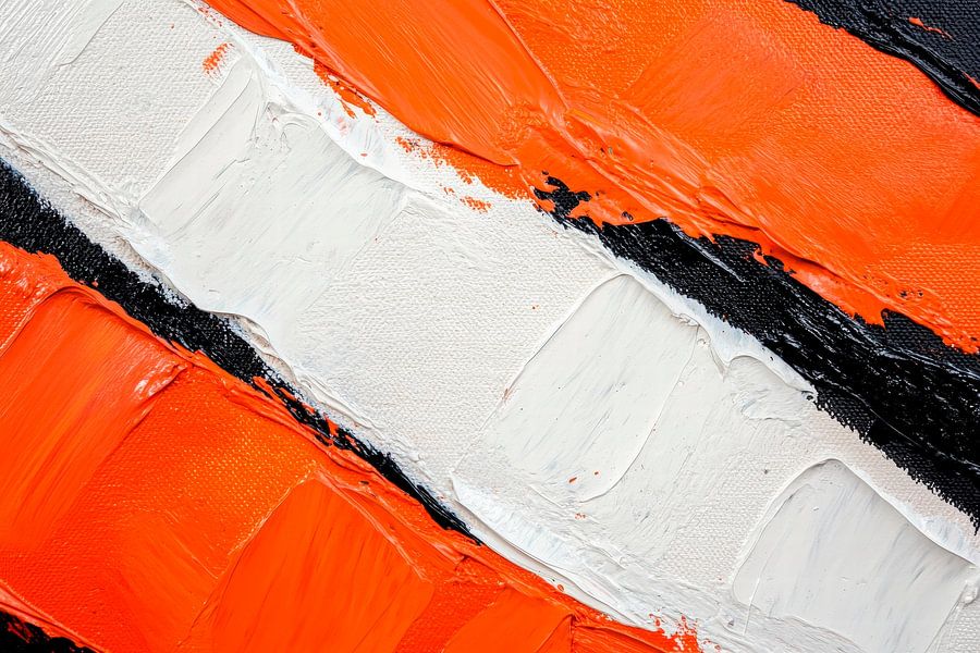 Mit seinen lebhaften Orangetönen und dramatischen Schwarz-Weiß-Kontrasten strahlt dieses Kunstwerk Energie und Dynamik aus. Die kräftigen Pinselstriche verleihen dem Bild eine spürbare Textur und Bewegung. Ideal platziert in einem modernen Wohnzimmer, wird es Gespräche anregen und einen Hauch von Kreativität in den Raum bringen.