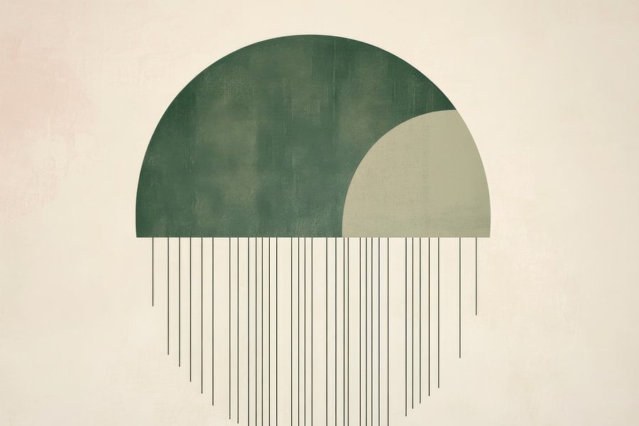 Ein geometrisches Spiel aus sanften Grüntönen entfaltet sich, während ein halbrunder Bogen harmonisch mit einer kleinen, abgerundeten Ecke verschmilzt. Unter ihm erstrecken sich filigrane Linien wie fallender Regen, die eine subtile Dynamik erzeugen. Minimalistisch und doch ausdrucksstark lädt dieses Design zur Reflektion und Träumerei ein.