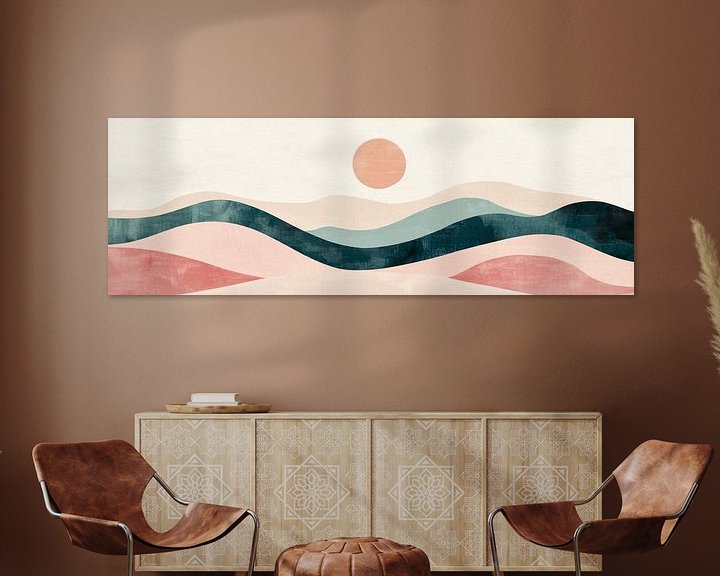 Sanfte Wellen in harmonischen Farbtönen fließen über die Leinwand und verleihen dem Bild eine beruhigende Dynamik. Ein sanfter Sonnenkreis schwebt am Horizont und taucht die Szenerie in warmen Lichtakzenten. Diese ruhige Landschaft lädt den Betrachter ein, in die Stille der Natur einzutauchen und den Moment der Harmonie zu genießen.