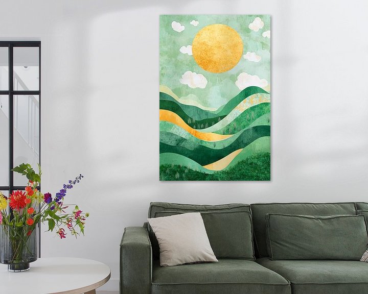 Erhältlich mit oder ohne Passepartout für eine stilvolle Präsentation von Abstrakte Landschaft mit goldenem Himmel Kunstwerken.