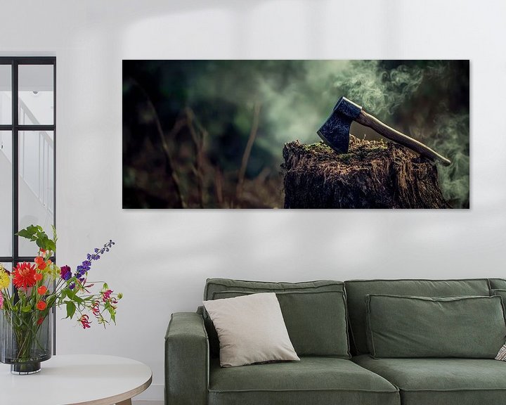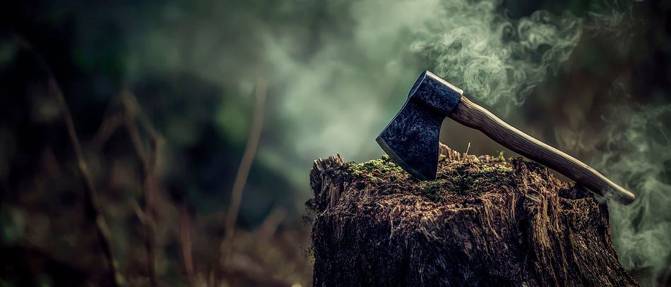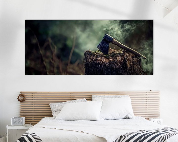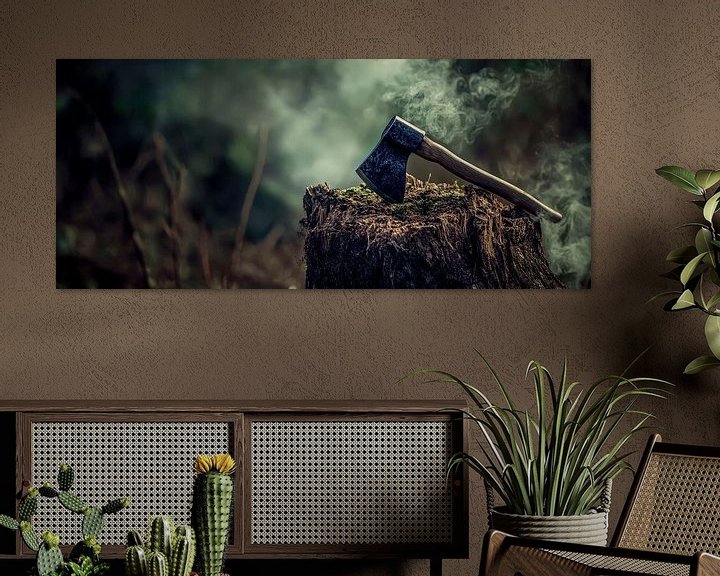 Ein beeindruckendes Stillleben, das die Ruhe eines mystischen Waldes mit der scharfen Präsenz einer Axt kombiniert. Der sanfte Rauch, der den Baumstumpf umhüllt, erzeugt eine geheimnisvolle Atmosphäre, die Abenteuer und wilde Natur verspricht. Perfekt für ein Wohnzimmer oder eine Werkstatt, um das Gefühl von Stärke und Freiheit zu vermitteln.