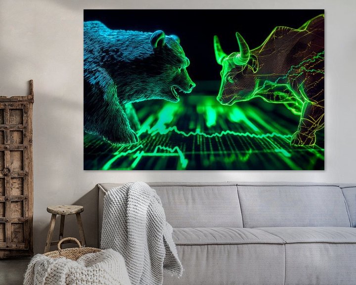 In einem elektrisierenden Duell stehen sich ein majestätischer Bär und ein kraftvoller Stier gegenüber, umgeben von pulsierenden, neonfarbenen Linien. Diese dynamische Konfrontation symbolisiert den ewigen Kampf zwischen Stärke und Anmut. Ideal für ein modernes Wohnzimmer oder ein kreatives Büro, verleiht es jedem Raum einen Hauch von Energie und Inspiration.