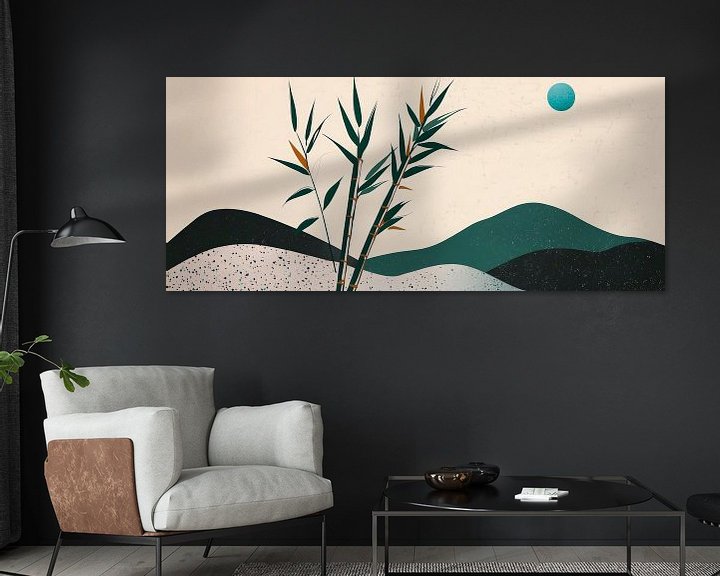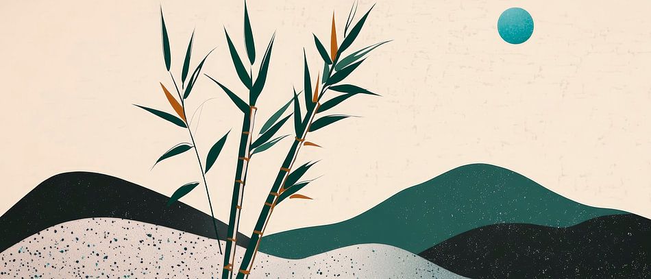 Wellen sanfter Hügel tanzen unter einem ruhigen, blauen Himmel, während elegante Bambussträucher dem Bild eine dynamische Note verleihen. Die harmonische Farbpalette schafft eine entspannende Atmosphäre, die perfekt für ein Wohnzimmer oder einen meditativen Raum ist. Ideal, um Ruhe und Naturverbundenheit in Ihre vier Wände zu bringen!