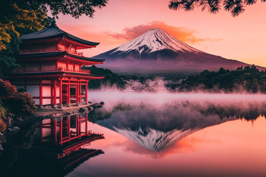 Ein strahlender Sonnenaufgang taucht die Szene in sanftes Rosa und Orange, während der majestätische Fuji im Hintergrund seine schneebedeckte Kuppe erhebt. Das leuchtend rote Gebäude spiegelt sich im ruhigen Wasser und schafft ein Bild der Harmonie und Gelassenheit. Ideal für das Wohnzimmer, verleiht es jedem Raum einen Hauch von fernöstlicher Ruhe.