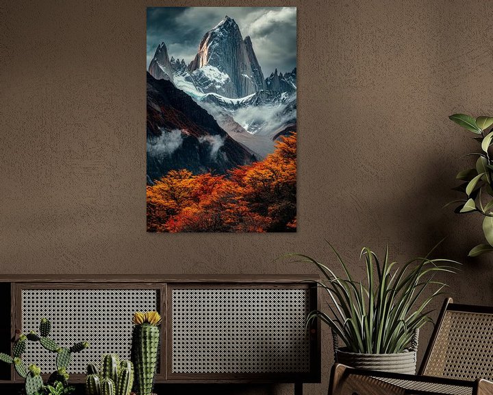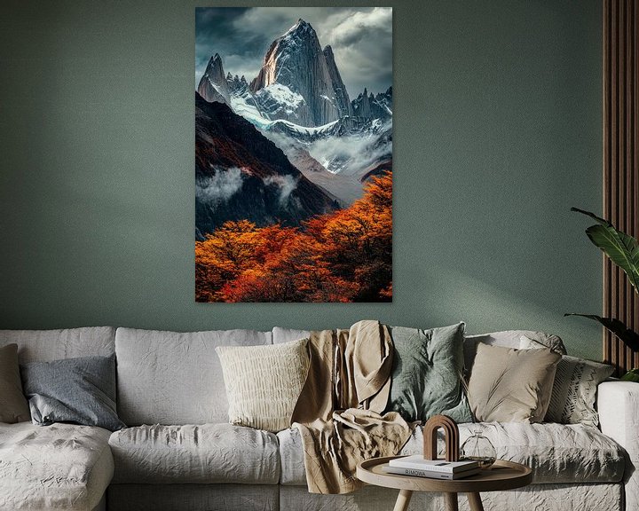 Majestätische Gipfel trotzen dem Himmel, umhüllt von mystischen Nebelschwaden. Das leuchtende Orange der Herbstwälder schafft einen faszinierenden Kontrast zur kühlen, schneebedeckten Bergspitze. Dieses fesselnde Landschaftsmotiv bringt einen Hauch von Abenteuer und Ruhe in jedes Wohnzimmer und lädt zu stundenlangen Träumereien ein. Ideal für Naturliebhaber!