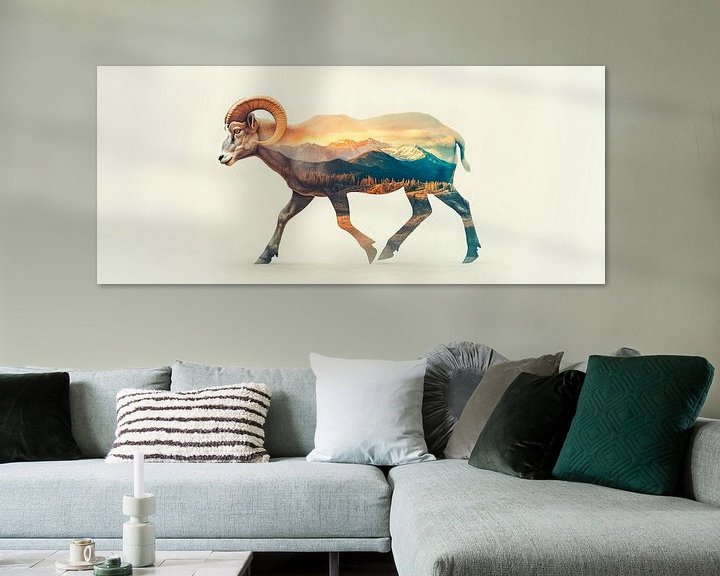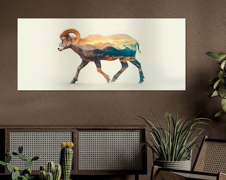 Ein majestätischer Widder schreitet mit kraftvoller Eleganz, sein Körper gefüllt mit traumhaften Landschaften und sanften Farben. Die harmonische Verbindung von Tier und Natur weckt ein Gefühl von Freiheit und Abenteuer. Diese Kreation bereichert jeden Raum, besonders das Wohnzimmer, wo sie eine inspirierende Atmosphäre schafft und Gespräche anregt.