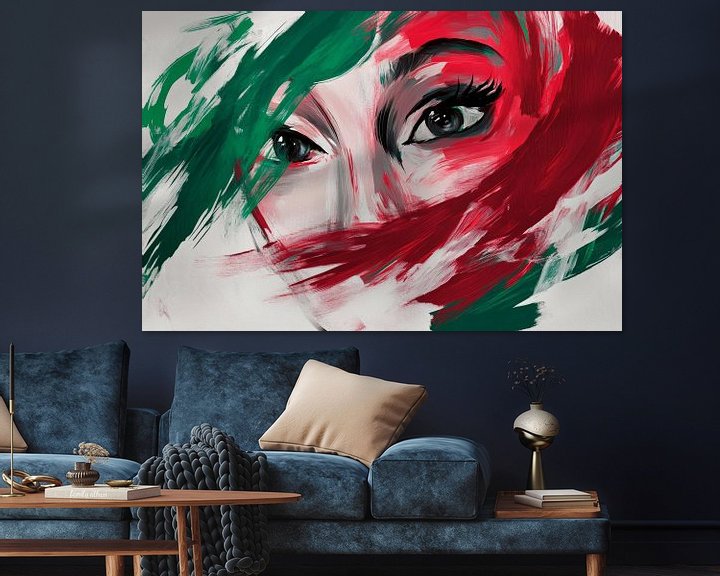 Mit kräftigen Pinselstrichen fängt das Kunstwerk die Intensität und Tiefe der Augen ein, während lebendige grüne und rote Farbtöne eine faszinierende Dynamik schaffen. Diese ausdrucksstarke Komposition eignet sich perfekt für das Wohnzimmer, wo sie Gespräche anregt und eine leidenschaftliche Stimmung verbreitet. Ein wahrhaft inspirierendes Stück für jede Wand!