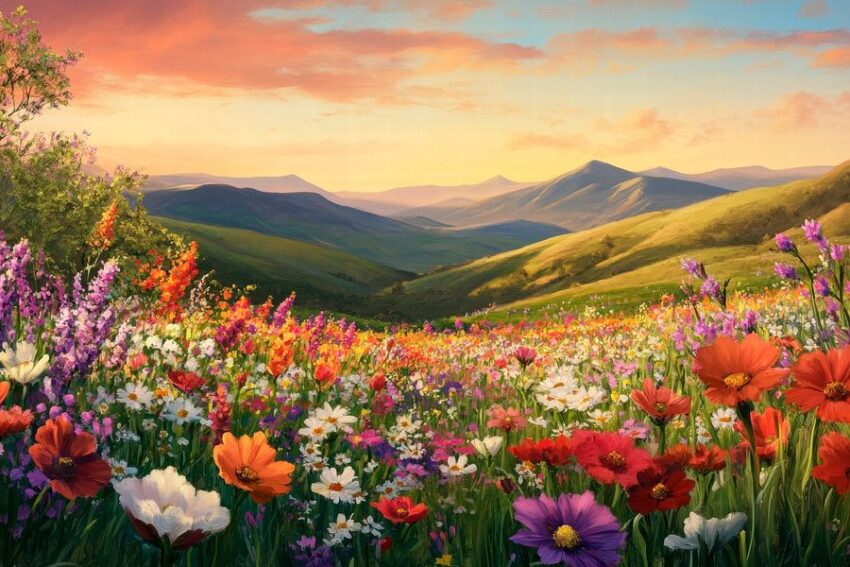 Ein farbenfrohes Blumenmeer breitet sich sanft über die hügelige Landschaft aus, während der Himmel in warmen Gelbtönen erstrahlt. Die lebhaften Farben der Blumen, von leuchtendem Rot bis sanftem Lila, schaffen eine harmonische Atmosphäre. Ideal für das Wohnzimmer, bringt dieses Kunstwerk die Frische der Natur und lädt zum Träumen ein.