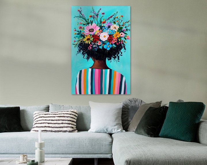 Erhältlich mit oder ohne Passepartout für eine stilvolle Präsentation von Blumenkranz auf lockigem Haar – Farbexplosion Kunstwerken.