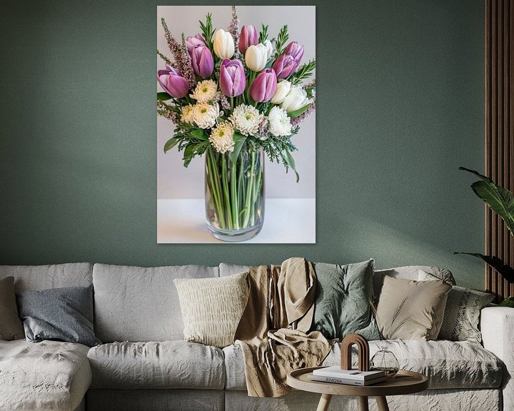 In einem eleganten Glasvase entfaltet sich ein zauberhaftes Bouquet aus lila und weißen Tulpen, umrahmt von zarten, blühenden Akzenten. Die harmonische Farbgebung und die frische Ausstrahlung bringen Leben in jede Ecke. Ideal für das Wohnzimmer, strahlt dieser florale Eyecatcher eine einladende Wärme aus, die Besucher sofort begeistert.