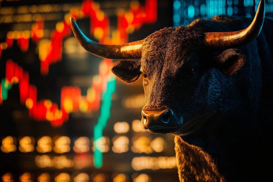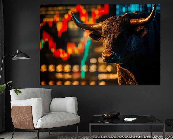 Erhältlich mit oder ohne Passepartout für eine stilvolle Präsentation von Bulle vor Aktiencharts – Dynamisch Kunstwerken.