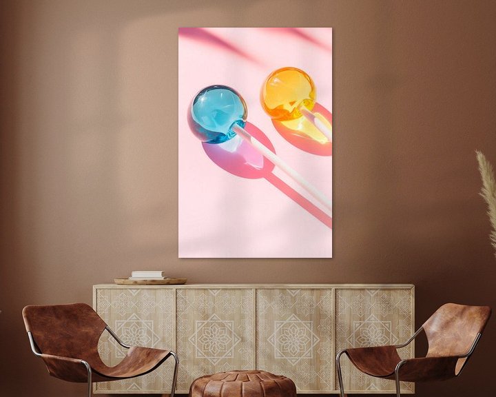 Zwei schimmernde Lutscher in strahlenden Farben leuchten vor einem sanften, rosa Hintergrund. Ihre runden, glatten Oberflächen reflektieren das Licht und werfen spielerische Schatten. Perfekt für eine Küche oder ein fröhliches Wohnzimmer, verleihen sie jedem Raum eine Prise Leichtigkeit und kindliche Freude. Ideal, um Erinnerungen an unbeschwerte Zeiten zu wecken!