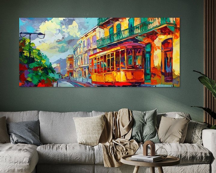 Ein lebhaftes Spiel aus Farben erweckt das Stadtleben zum Leben, mit einem leuchtend orangefarbenen Straßenbahn, die durch eine malerische Straße voller charmante Gebäude gleitet. Die dynamische Szene strahlt eine Atmosphäre von Abenteuer und Nostalgie aus – perfekt für das Wohnzimmer, um Gäste zu inspirieren und den Alltag zu beleben.