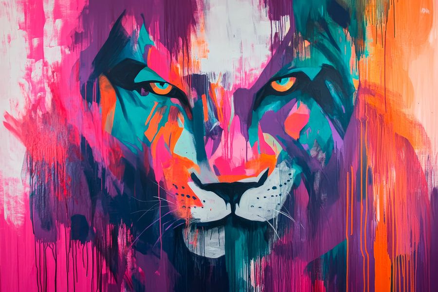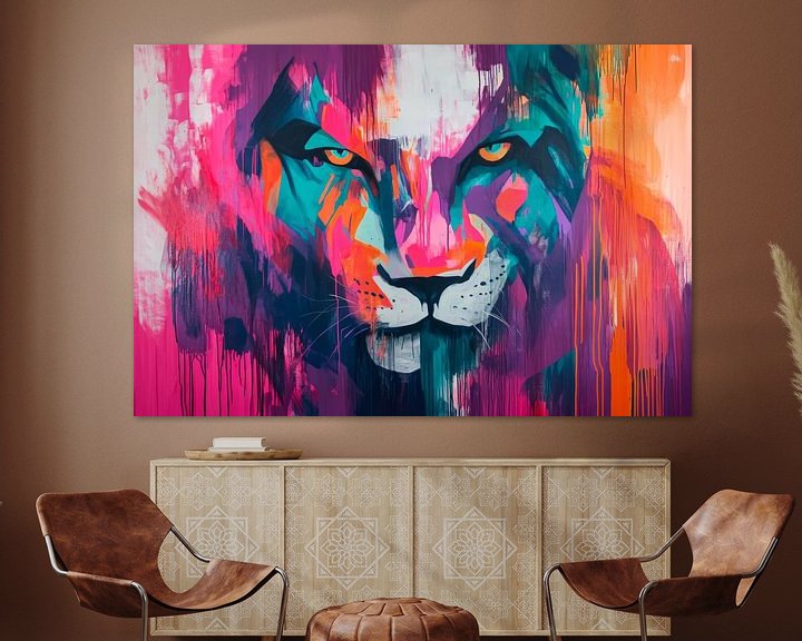 Ein majestätischer Löwe, umgeben von lebendigen Farben, fängt sofort die Aufmerksamkeit ein. Die kraftvollen, strahlenden Töne von Pink, Blau und Orange verleihen diesem Kunstwerk einen dynamischen Charakter. Ideal für ein Wohnzimmer, bringt es Energie und Stärke in den Raum, während es gleichzeitig eine einladende Wärme ausstrahlt.