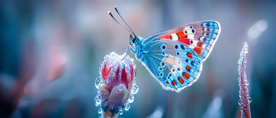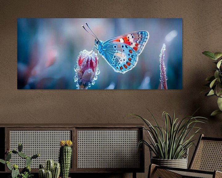 Gerahmte Poster mit Bunter Schmetterling im Morgennebel Kunstdruck
