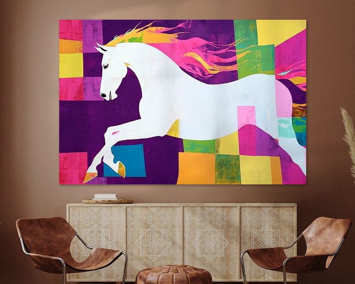 Erhältlich mit oder ohne Passepartout für eine stilvolle Präsentation von Buntes Einhorn im modernen Stil Kunstwerken.