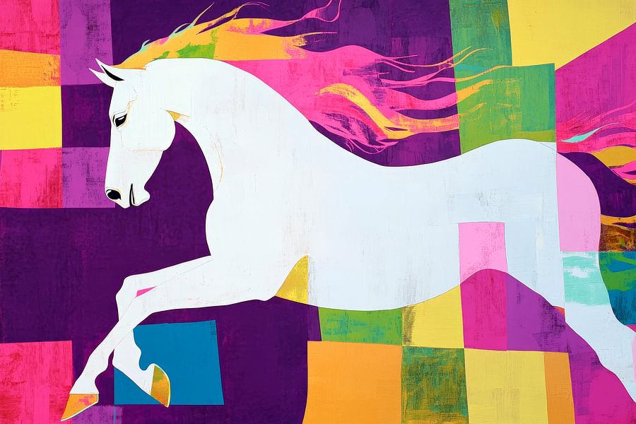 Ein strahlendes Einhorn schwebt majestätisch durch ein lebendiges Farbenspiel aus leuchtenden Gelb-, Pink- und Lilatönen. Die kraftvolle Ausstrahlung und das fröhliche Design verleihen jedem Raum eine fantasievolle Note. Ideal für ein Kinderzimmer oder einen kreativen Bereich im Zuhause, wo Träume und Inspiration im Vordergrund stehen.