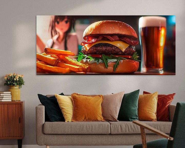 • Erhältlich mit oder ohne Passepartout für eine stilvolle Präsentation von Burger mit Pommes und Bier im Fokus Kunstwerken.