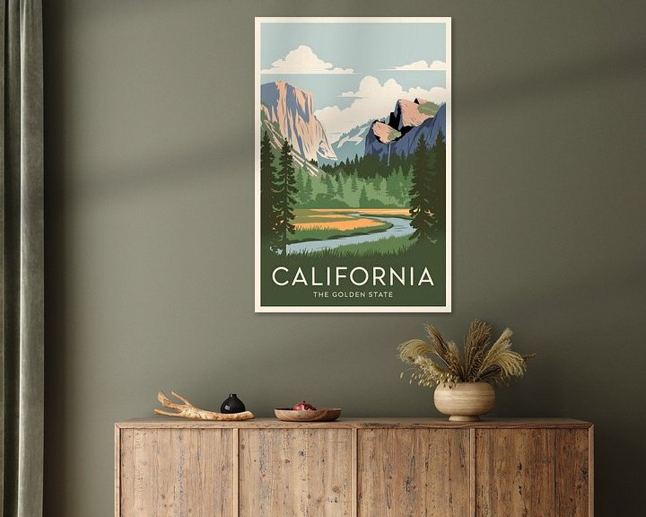 In sanften Grüntönen schimmert die majestätische Landschaft Kaliforniens, umrahmt von imposanten Bergen und einem friedlichen Fluss. Die Wolken scheinen fast mit den Gipfeln zu tanzen, während die Natur in ihrer vollen Pracht erstrahlt. Dieses Kunstwerk bringt ein Hauch von Freiheit und Abenteuer in jedes Wohnzimmer und lädt zum Träumen ein.