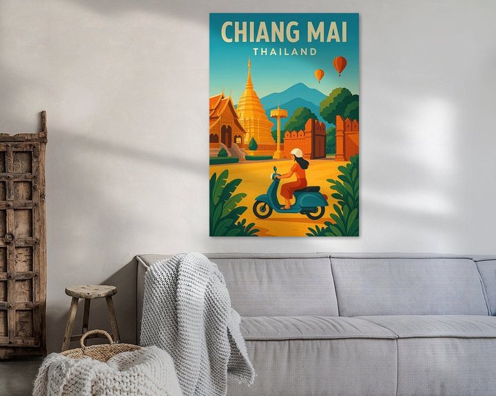 Ein Farbtraum in sanften Pastelltönen entführt den Betrachter nach Chiang Mai. Eine Königin auf ihrem Scooter, umgeben von majestätischen Tempeln und sanften Hügeln, strahlt ein Gefühl von Freiheit und Abenteuer aus. Dieses Kunstwerk eignet sich perfekt für ein Wohnzimmer, um inspirierende Reiseträume zu wecken und Gespräche zu fördern.