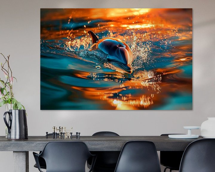 Die lebhafte Szenerie zeigt einen eleganten Delfin, der spielerisch durch das glitzernde Wasser springt, während die warmen Sonnenstrahlen die Oberfläche in goldenes Licht tauchen. Dieses fesselnde Motiv bringt ein Gefühl von Freiheit und Lebensfreude in jeden Raum und eignet sich besonders gut für das Wohnzimmer, wo es positive Energie und Entspannung fördert.