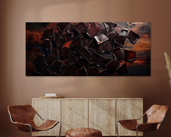 Erhältlich mit oder ohne Passepartout für eine stilvolle Präsentation von Dunkle Schokoladenstückchen auf Holz Kunstwerken.