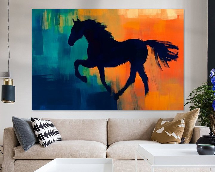In lebhaften, fließenden Farben entfaltet sich die dynamische Silhouette eines Pferdes, das kraftvoll über eine künstlerische Szenerie galoppiert. Die harmonische Kombination aus Blau- und Orangetönen vermittelt ein Gefühl von Freiheit und Bewegung. Dieses Bild eignet sich perfekt für ein Wohnzimmer oder ein kreatives Arbeitszimmer, um Inspiration und Energie zu fördern.
