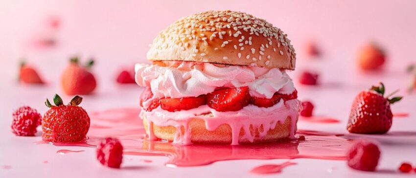 Erhältlich mit oder ohne Passepartout für eine stilvolle Präsentation von Erdbeer-Sahne-Burger auf rosa Hintergrund Kunstwerken.