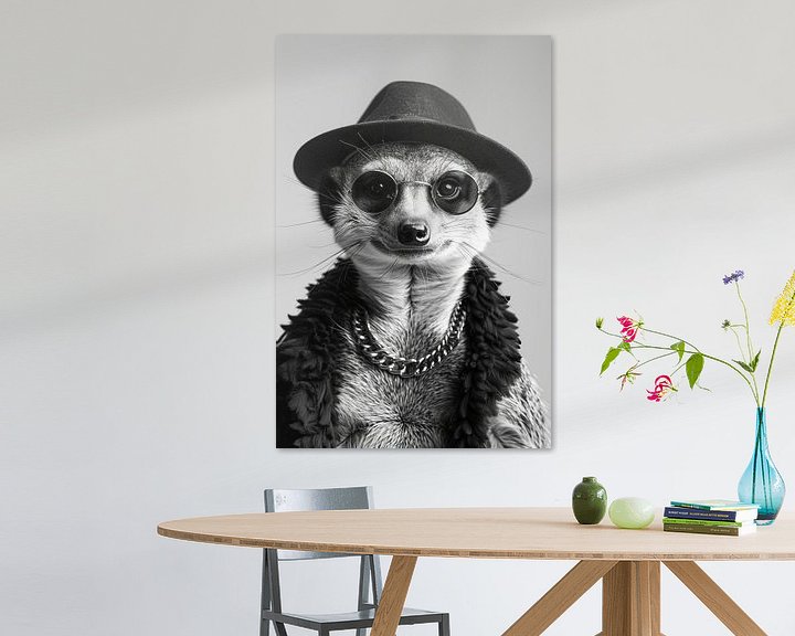 Porträt eines Erdmännchens in stilvoller Kleidung, inklusive Hut und Sonnenbrille, aufgenommen in einem monochromen Stil.