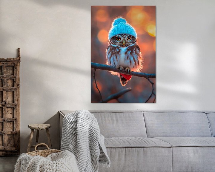 Mit einem entzückenden blauen Mützchen und großen, leuchtenden Augen strahlt dieser kleine Eulengenosse Charme und Verspieltheit aus. Seine sanften Farben harmonieren perfekt mit der goldenen Abendstimmung im Hintergrund. Dieses fröhliche Kunstwerk eignet sich hervorragend für das Wohnzimmer, um eine einladende und warmherzige Atmosphäre zu schaffen.