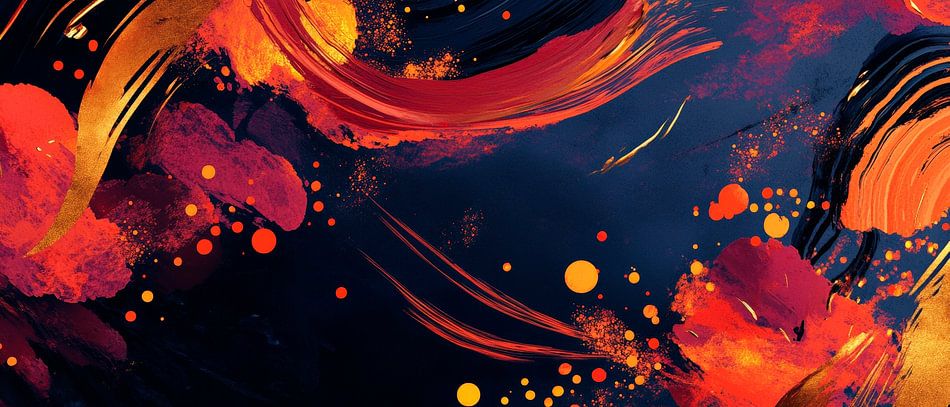 Mit lebendigen Farbtupfern und dynamischen Pinselstrichen entfaltet dieses Kunstwerk eine magische Energie. Die Kombination aus tiefem Blau, warmen Rottönen und goldenen Akzenten zieht den Betrachter in eine harmonische Welt voller Bewegung und Emotionen. Ideal für das Wohnzimmer, um eine einladende und inspirierende Atmosphäre zu schaffen.