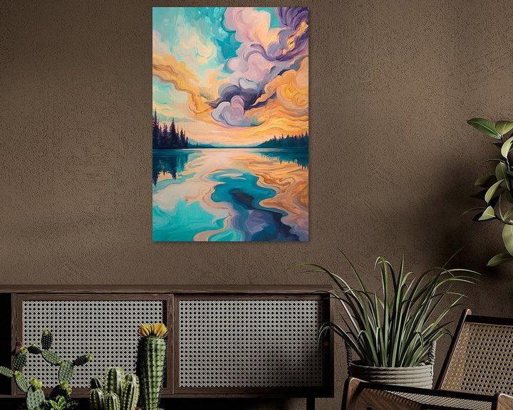 Ein faszinierendes Zusammenspiel aus sanften Farben und eindrucksvollen Wolkenformationen spiegelt sich im ruhigen Wasser wider, während die silhouettes von Bäumen sanft in den Hintergrund rücken. Diese harmonische Szenerie bringt Ruhe und Inspiration mit sich und eignet sich perfekt für ein Wohnzimmer, um eine entspannende Atmosphäre zu schaffen.