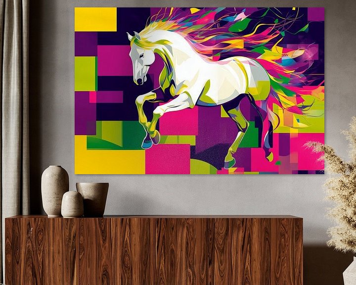 Erhältlich mit oder ohne Passepartout für eine stilvolle Präsentation von Farbenfrohes Pferd im modernen Stil Kunstwerken.