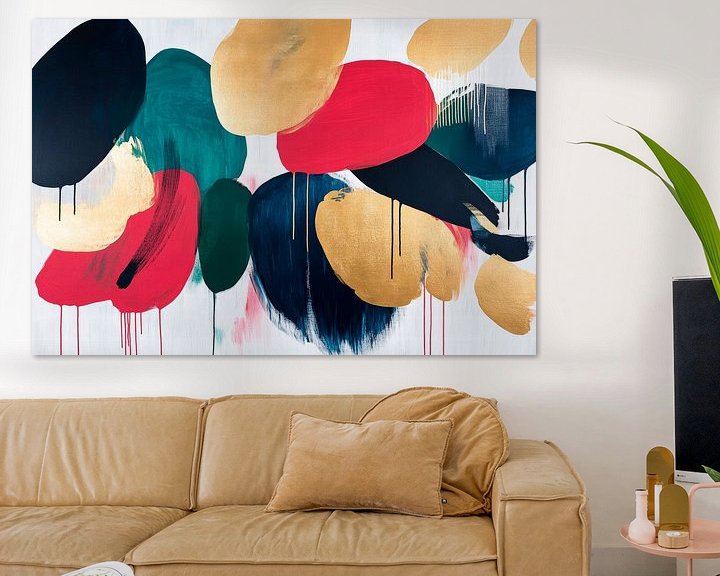 Lebendige Farbkleckse tanzen in harmonischem Chaos über die Leinwand, mit goldglänzenden Akzenten, die das Licht einfangen. Die kraftvollen Rot- und Grüntöne verleihen dem Raum eine dynamische Energie, während die sanften goldenen Flächen Eleganz ausstrahlen. Ideal für das Wohnzimmer, wo kreative Gespräche und Inspiration lebendig werden.