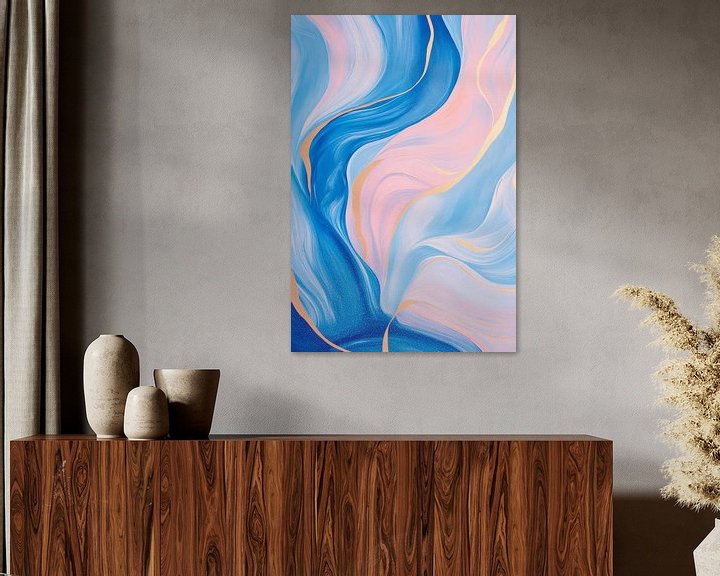 Sanfte Wellen aus Blau und zartem Rosa spielen harmonisch miteinander, durchzogen von filigranen goldenen Linien, die einen Hauch von Eleganz verleihen. Diese kunstvolle Komposition vermittelt ein Gefühl von Ruhe und Leichtigkeit und eignet sich perfekt für ein Schlafzimmer, wo sie eine entspannende Atmosphäre schafft.