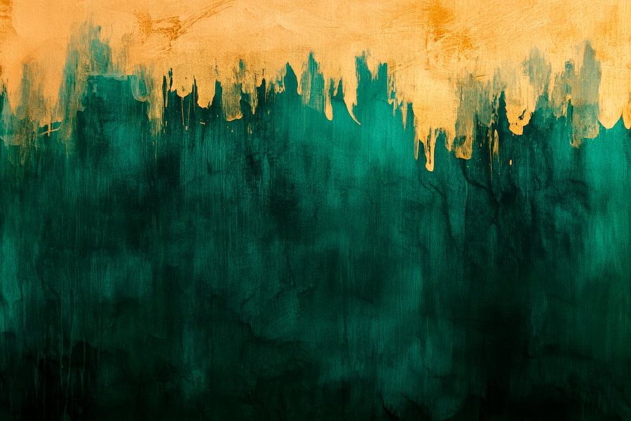 Ein faszinierendes Farbenspiel aus tiefem Grün und warmem Gold zieht den Blick an und vermittelt ein Gefühl von Ruhe und Harmonie. Die sanften Übergänge verleihen dem Raum eine dynamische Energie. Dieses Kunstwerk passt perfekt in ein Wohnzimmer, wo es Gespräche anregt und eine einladende Atmosphäre schafft.
