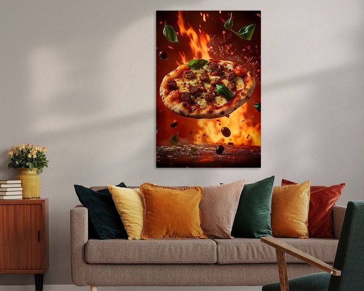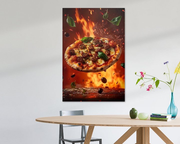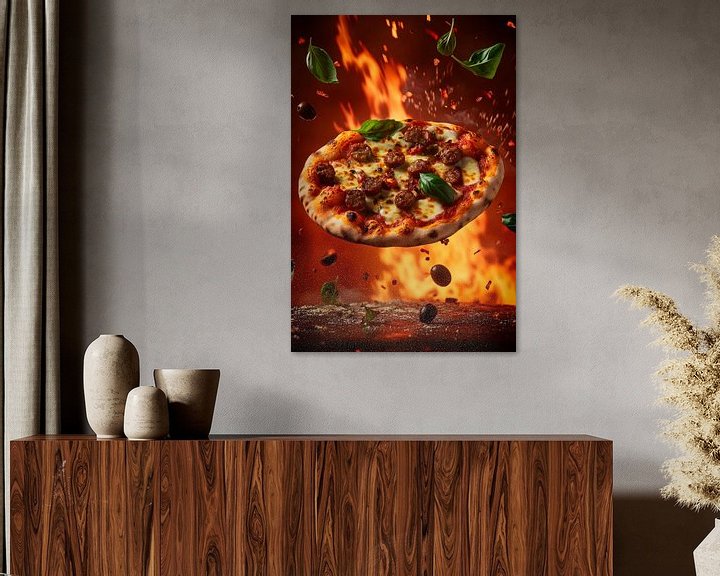 Sie sehen: Fliegende Pizza in Flammen – Köstlich und Dynamisch Poster  59.00