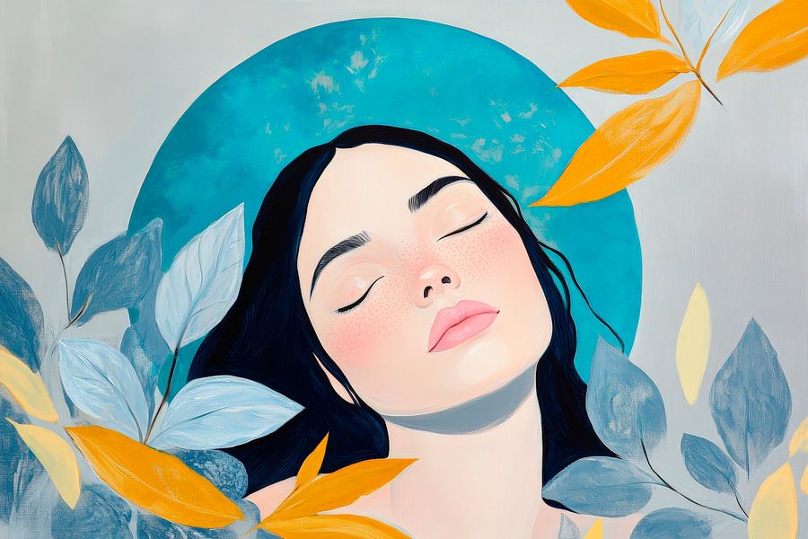 Gerahmte Poster mit Frau im Blätterrahmen – Farbige Ruhe Kunstdruck