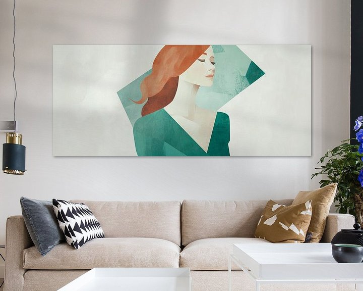 Eine anmutige Frau mit verträumtem Ausdruck, umgeben von sanften, geometrischen Formen in beruhigenden Grüntönen, strahlt eine faszinierende Ruhe aus. Dieses kunstvolle Werk, das Eleganz und innere Stärke vereint, verleiht einem Wohnzimmer oder Schlafzimmer eine harmonische Note und lädt zur Reflektion ein.