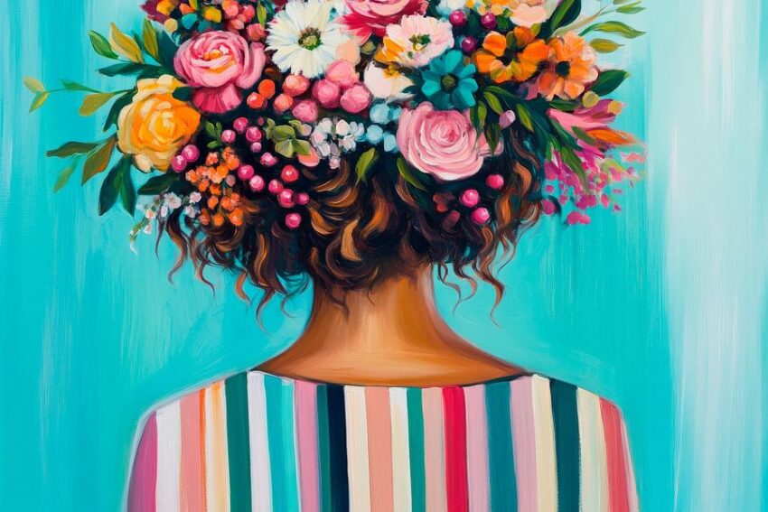 Erhältlich mit oder ohne Passepartout für eine stilvolle Präsentation von Frau mit Blumenkranz – Farbige Stripes Kunstwerken.