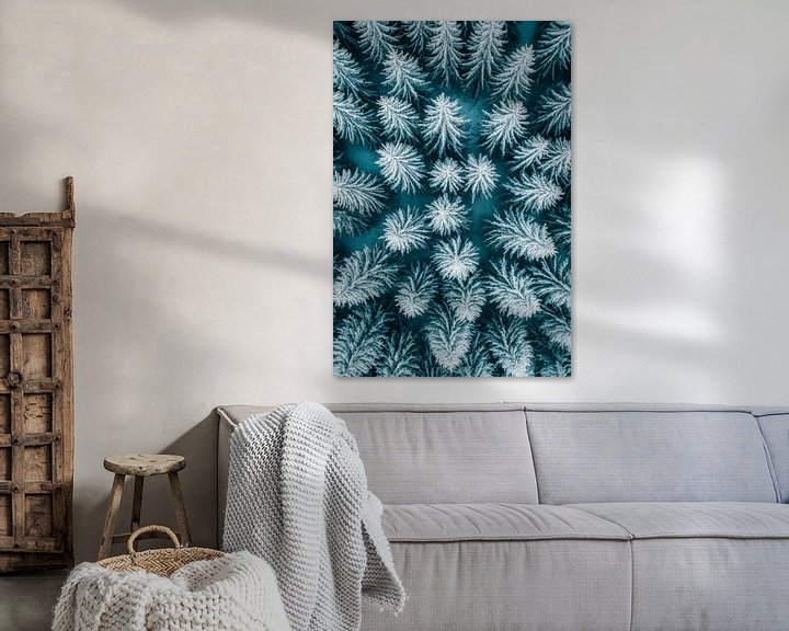 Ein kühles Winterwunderland entfaltet sich in einem filigranen Muster aus schneebedeckten Tannenzweigen. Die zarten, frostigen Spitzen funkeln im Licht, während die kühle blaue Hintergrundfarbe eine ruhige, melancholische Atmosphäre schafft. Hier scheint die nature ein geometrisches Kunstwerk aus Kälte und Eleganz zu schaffen, das die Schönheit der frostigen Jahreszeit feiert.
