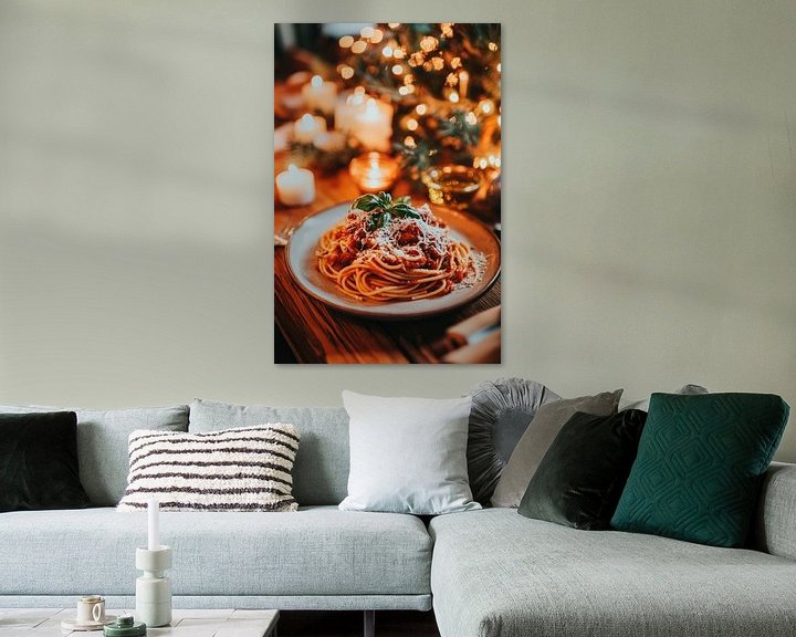 Erhältlich mit oder ohne Passepartout für eine stilvolle Präsentation von Gemütliches Pasta-Dinner bei Kerzenschein Kunstwerken.
