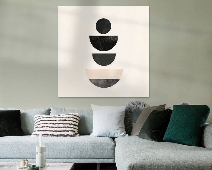 Sanfte geometrische Harmonien entfalten sich in einer eleganten Anordnung von Formen. Ein kleiner, schwarzer Kreis thront über dem Wechselspiel aus Halbkreisen und unterschiedlichen Farbtönen. Die sanften Kontraste zwischen tiefem Schwarz und hellem Beige schaffen eine beruhigende Balance, die die Augen zum Verweilen einlädt und die Vorstellungskraft anregt.