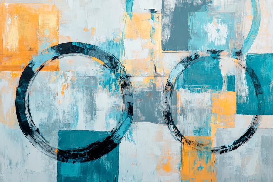 Abstrakte Formen tanzen über die Leinwand, während kräftige Gelbtöne in harmonischem Kontrast zu kühlen Blautönen stehen. Die dynamischen Kreise inmitten geometrischer Blöcke verleihen dem Raum eine moderne Note. Ideal für ein stilvolles Wohnzimmer, wo Kreativität und Eleganz aufeinander treffen.