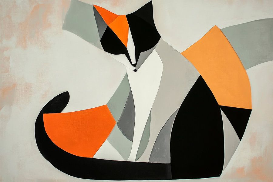 In geometrischen Formen und lebhaften Farben entfaltet sich die Silhouette einer Katze, die sowohl verspielt als auch geheimnisvoll wirkt. Die Kontraste von Schwarz, Grau und leuchtendem Orange verleihen dem Bild eine ansprechende Dynamik. Perfekt für das Wohnzimmer, bringt es einen Hauch von Kreativität und Lebensfreude in jeden Raum.