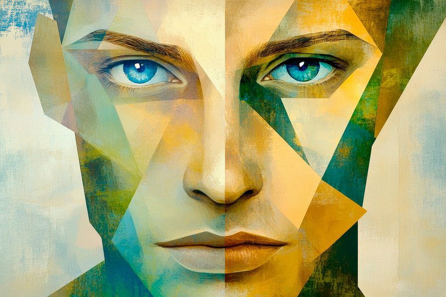 Ein faszinierendes Spiel aus Farben und Formen entfaltet sich, das einen Ausdruck von Tiefe und Introspektion vermittelt. Die intensiven blauen Augen ziehen die Betrachter in ihren Bann, während die geometrischen Elemente eine moderne, dynamische Ästhetik schaffen. Dieses Kunstwerk verleiht jedem Wohnzimmer eine kreative und nachdenkliche Atmosphäre.