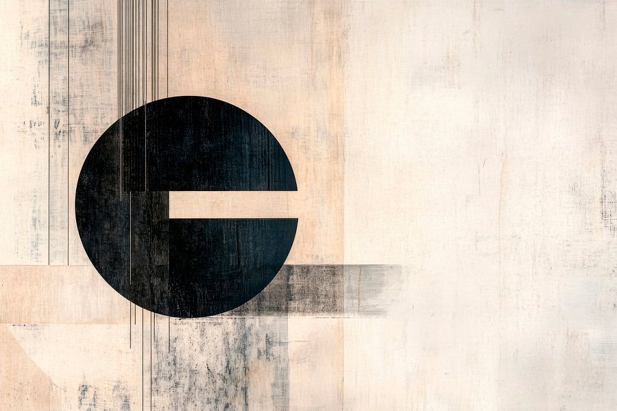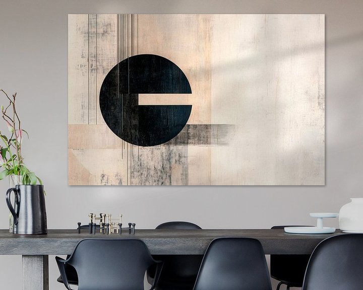 Ein kraftvolles Spiel aus klaren Linien und kontrastierenden Farben erweckt sofort die Aufmerksamkeit. Der große schwarze Kreis, umgeben von sanften, neutralen Tönen, strahlt Moderne und Eleganz aus. Perfekt für ein stilvolles Wohnzimmer, fügt dieses Kunstwerk einen Hauch zeitgenössischer Ästhetik hinzu und verwandelt den Raum in einen Ort der Inspiration.