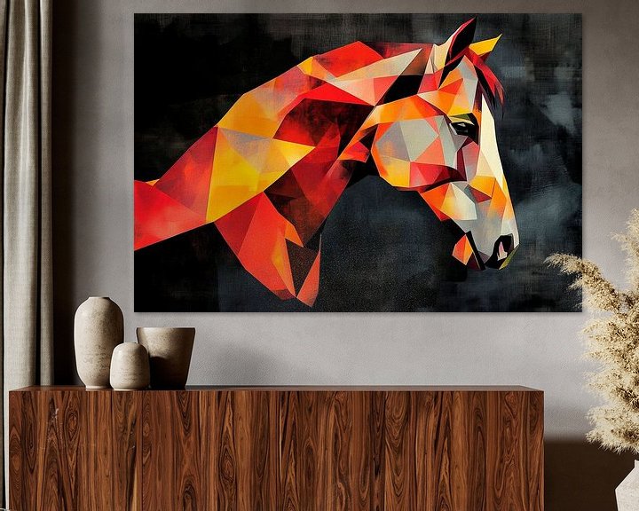 Erhältlich mit oder ohne Passepartout für eine stilvolle Präsentation von Geometrisches Pferdeporträt in Orange-Tönen Kunstwerken.